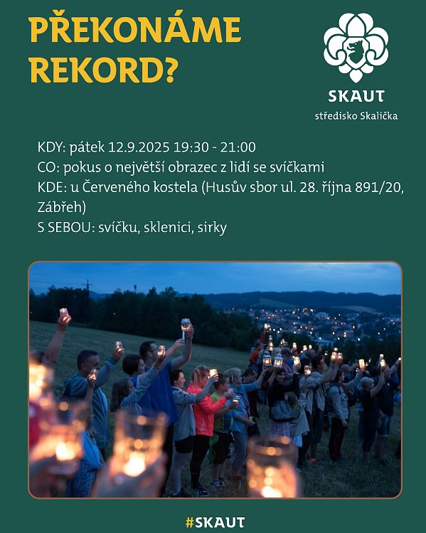 Součástí programu bude také pokus o překonání rekordu, na kterou je zvaná i široká veřejnost. V pátek 12. září v 19:30 hodin od „červeného“ kostela u Moravské Sázavy účastníci zamíří na Humenec, kde vznikne světelný obrazec skautské lilie. Cílem je překonat rekord z roku 2018, kdy se do tvorby podobného obrazce zapojilo 366 osob. K účasti stačí přinést svíčku ve sklenici a sirky.